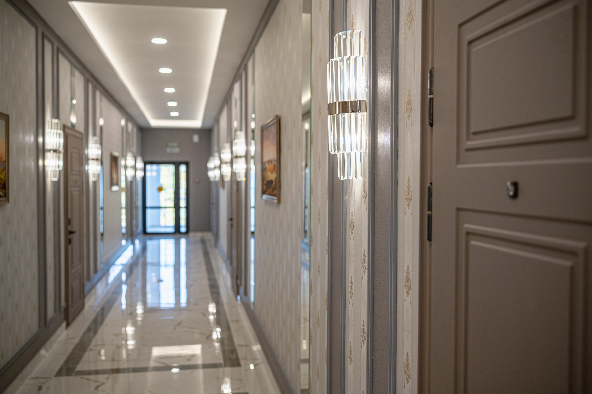 Места общего пользования оформлены в соответствии с дизайн-проектом, с использованием высококачественных материалов и дорогих осветительных приборов. Стены украшены картинами.