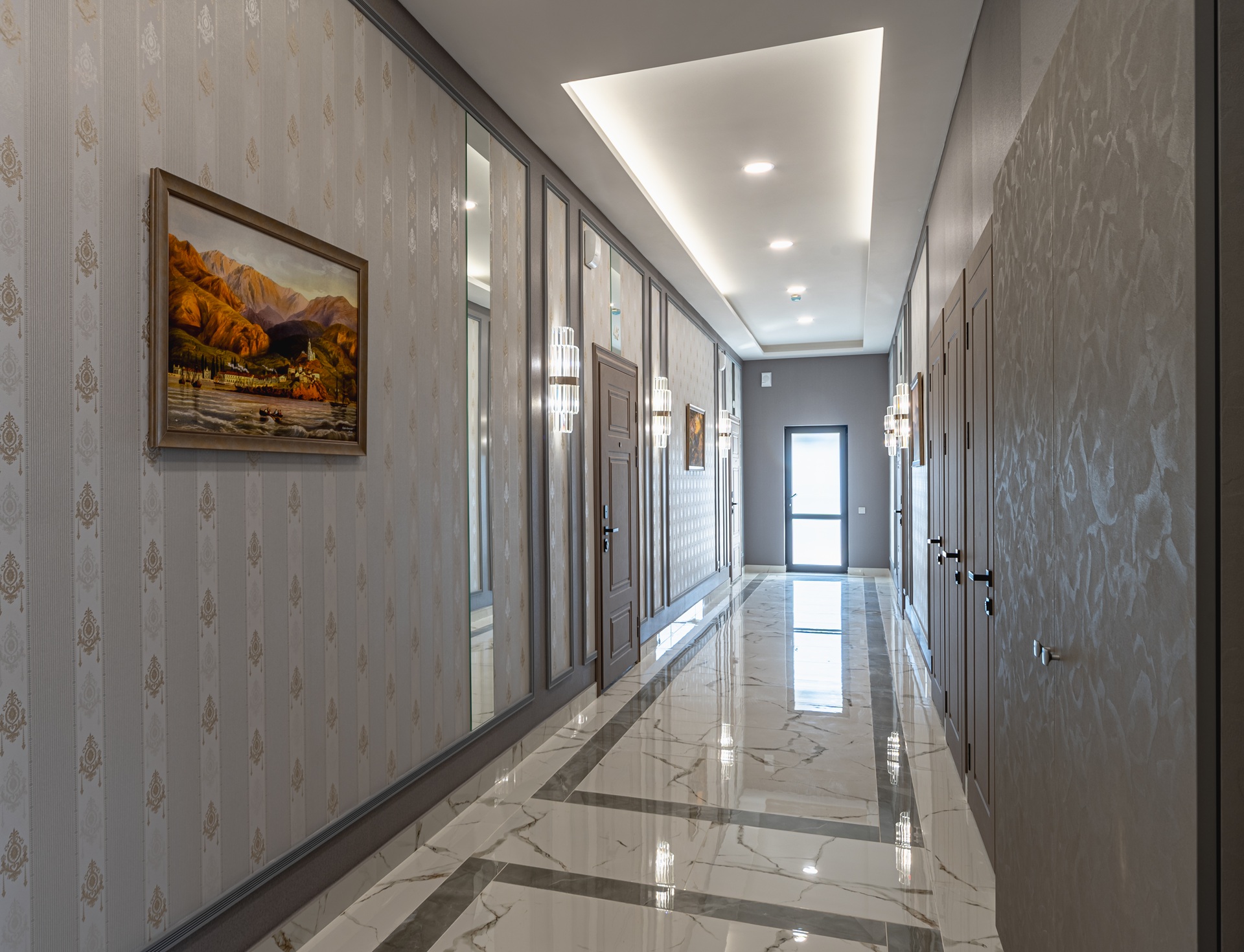 Места общего пользования оформлены в соответствии с дизайн-проектом, с использованием высококачественных материалов и дорогих осветительных приборов. Стены украшены картинами.